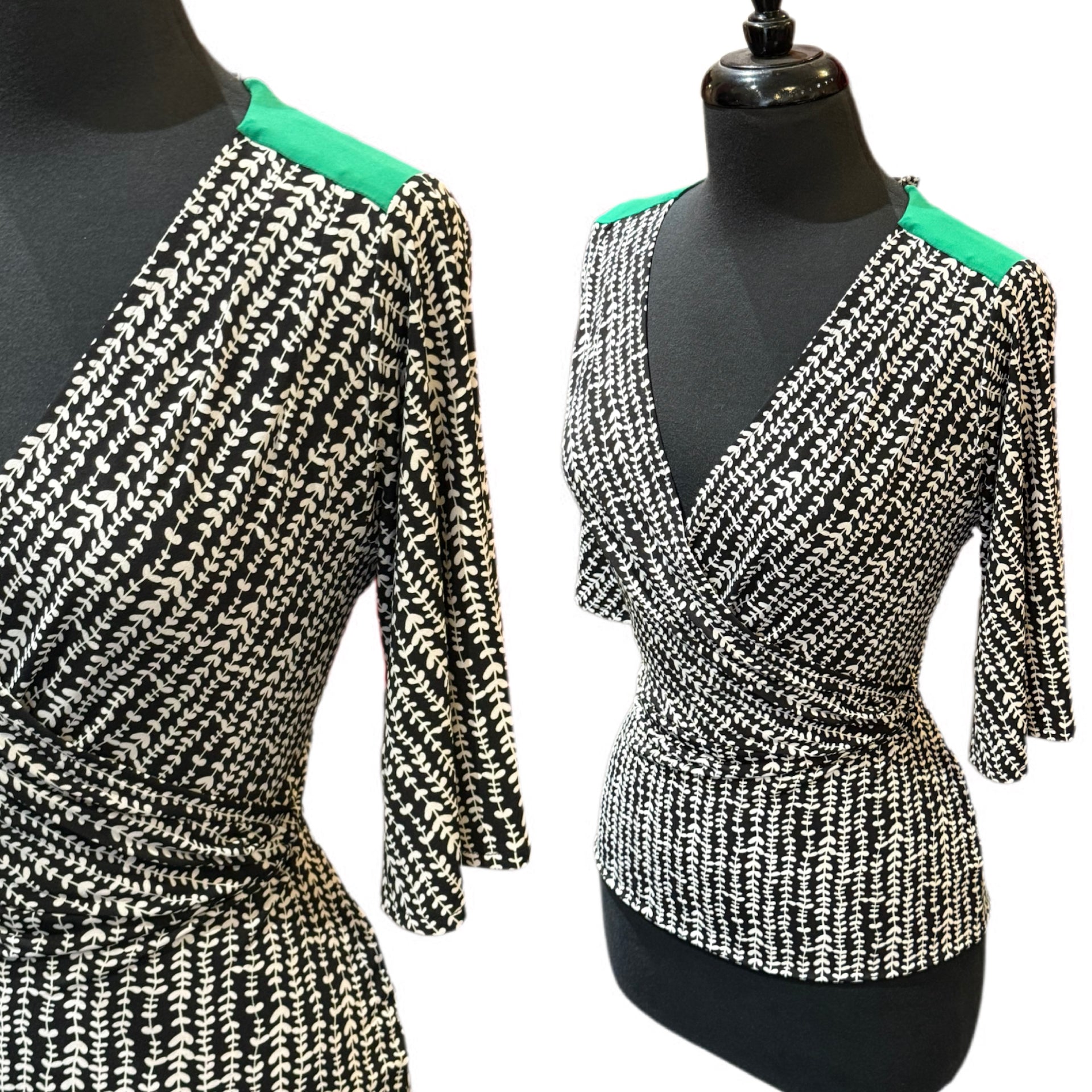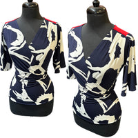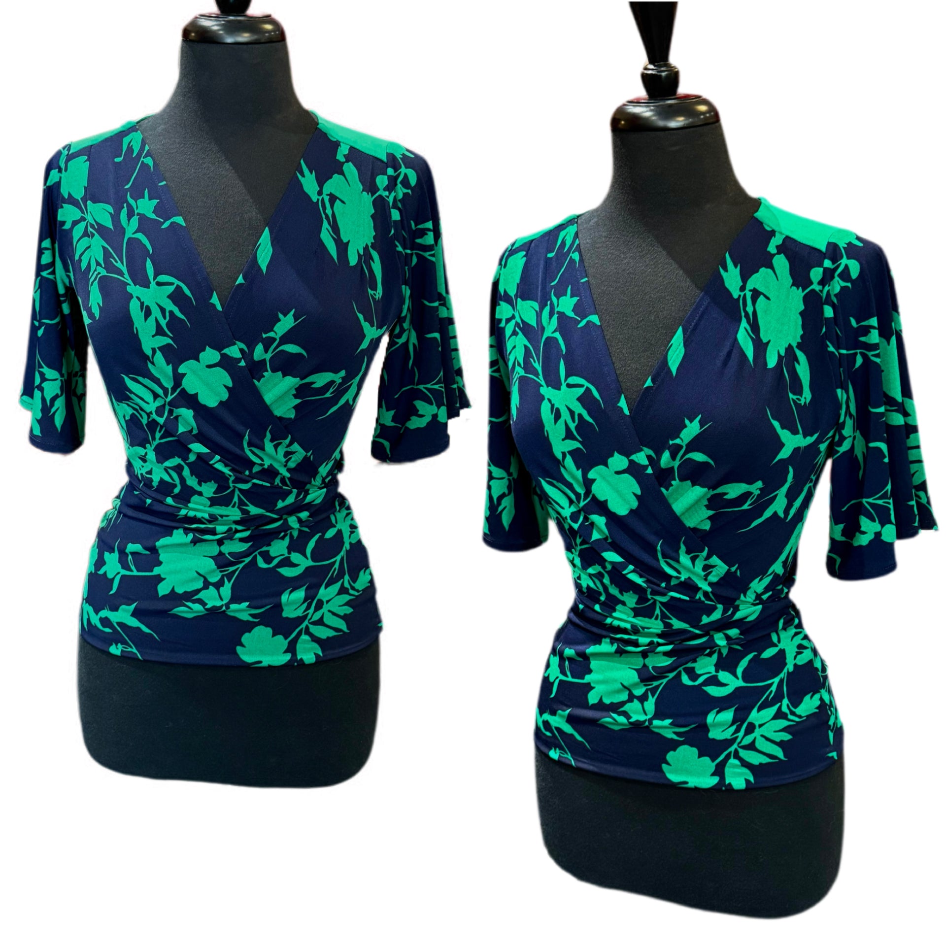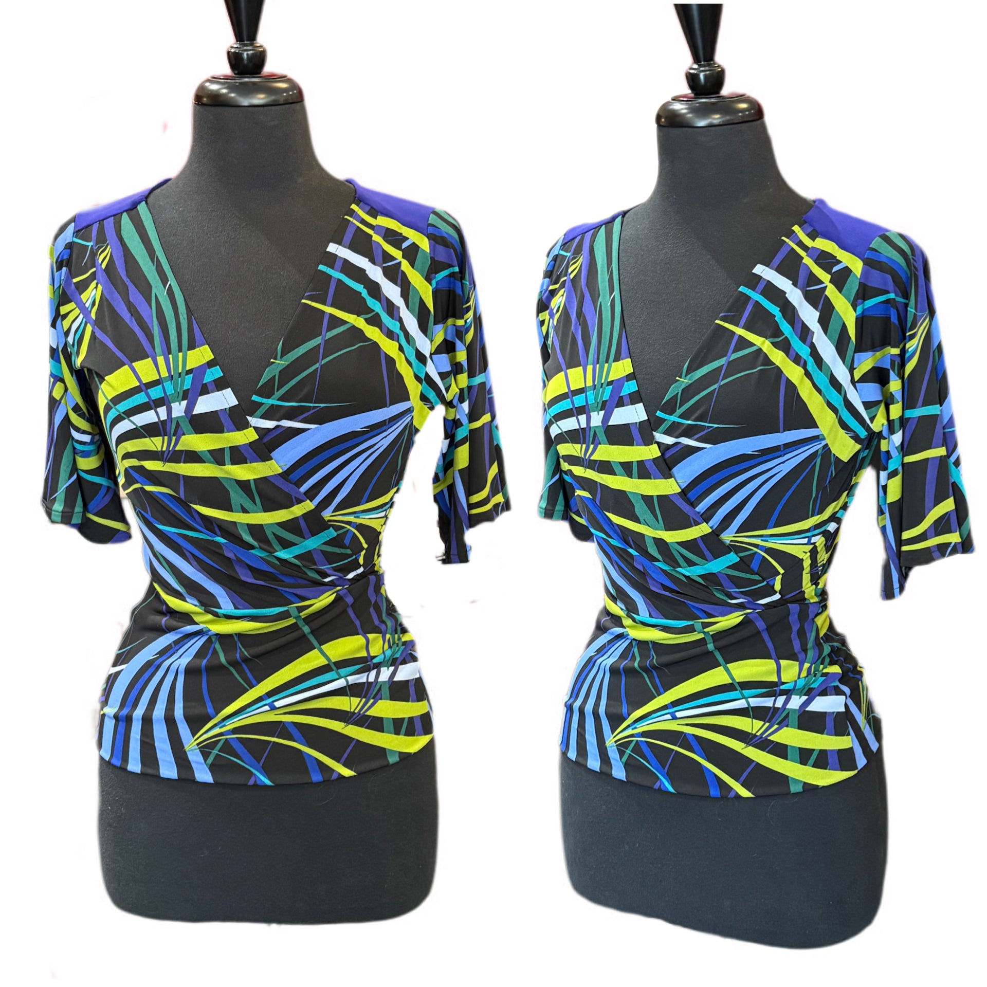 Featuring a very flattering cross over bodice with wide waistband, flirty sleeves and contrast shoulder detailing, the Anjelica Jersey Top is a wonderful edition to any discerning fashionista's wardrobe.