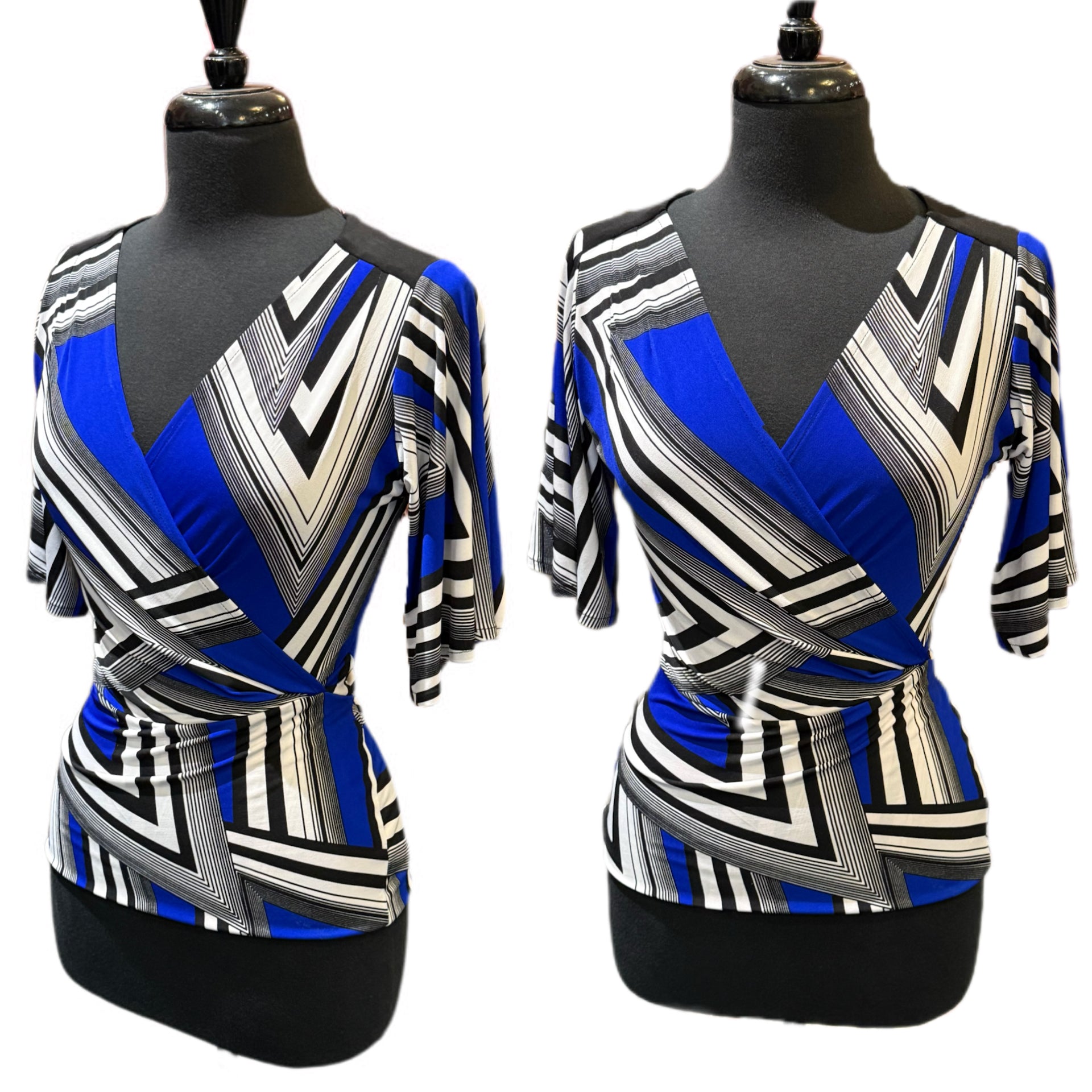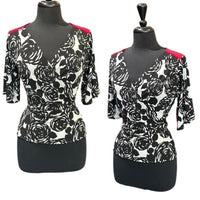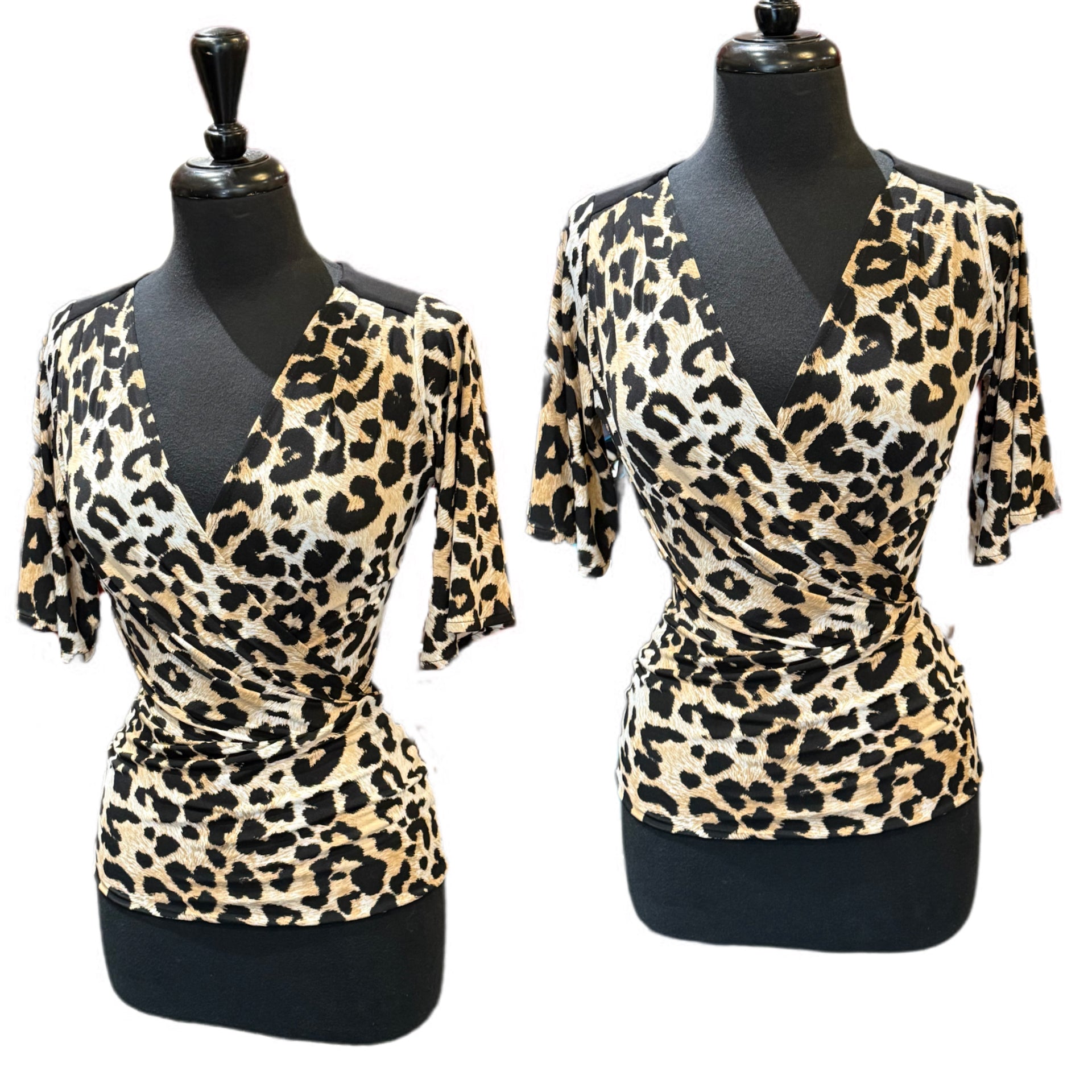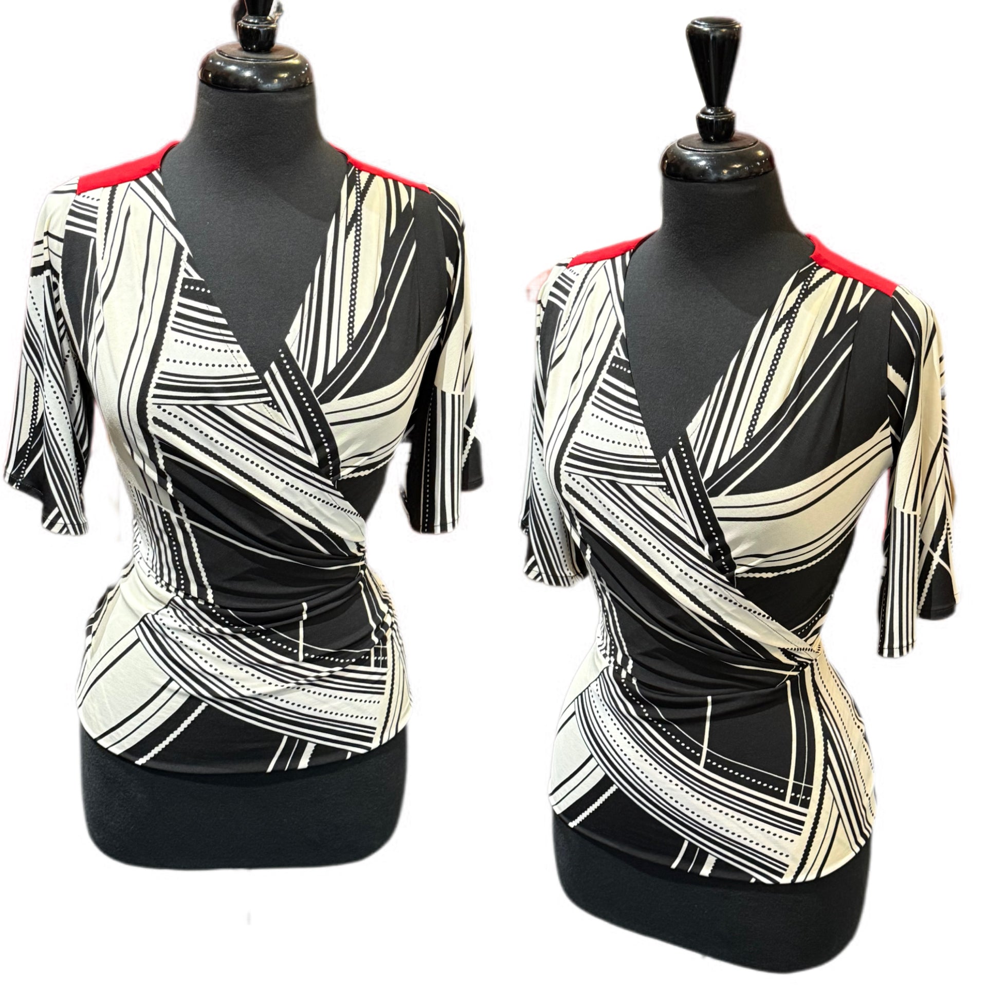 Featuring a very flattering cross over bodice with wide waistband, flirty sleeves and contrast shoulder detailing, the Anjelica Jersey Top is a wonderful edition to any discerning fashionista's wardrobe.